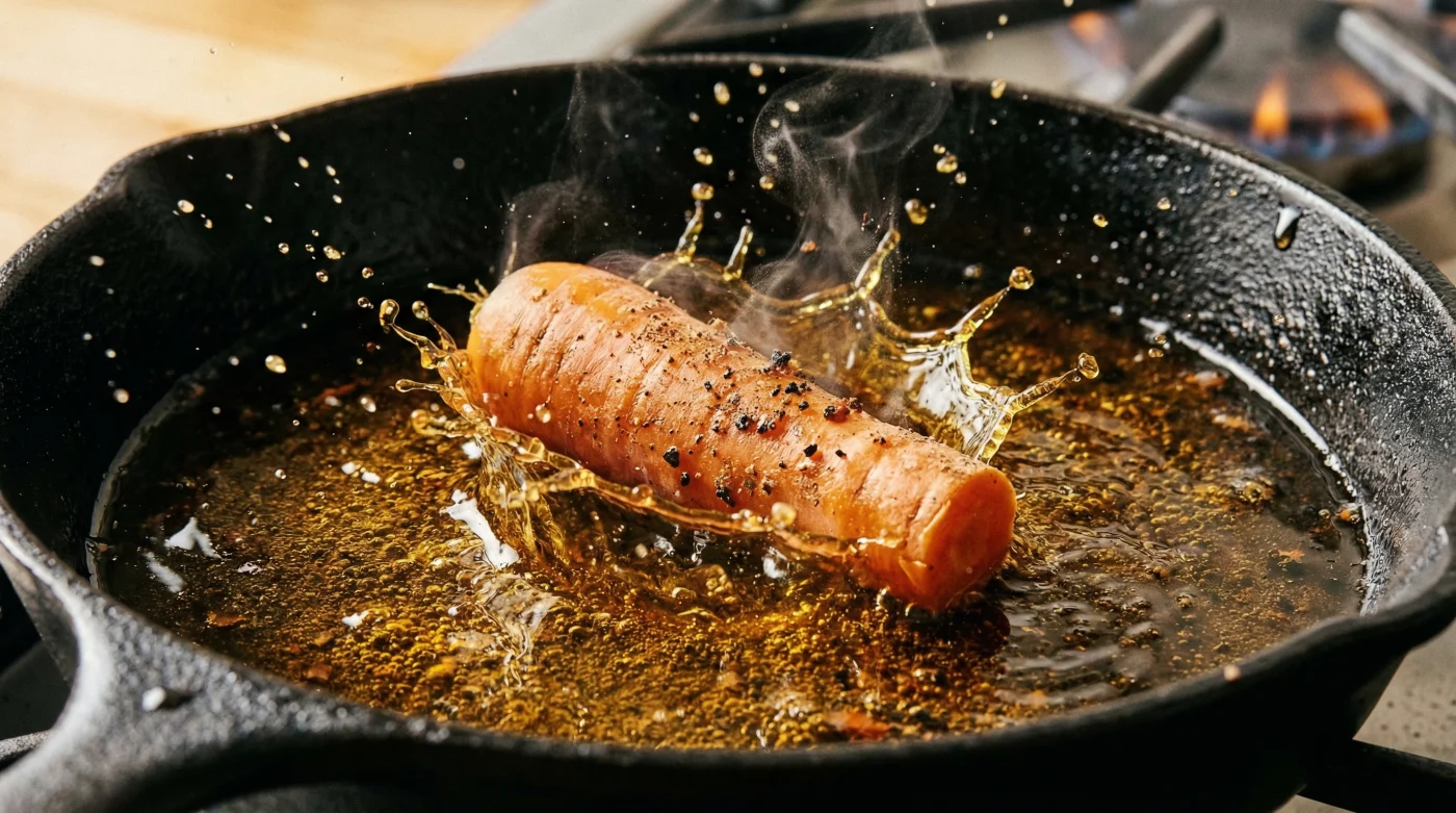 Pour your fresh peanut oil into a heavy-bottomed cast-iron skillet or enameled Dutch oven. Attach a reliable deep-fry thermometer to the side and begin heating the liquid gradually over medium-high heat. When the temperature reaches exactly 350 degrees Fahrenheit, carefully lower the 2-inch carrot cylinder into the liquid using metal tongs. You will notice an immediate, gentle bubbling action around the vegetable—this is the targeted release of internal moisture that helps perfectly balance the localized thermal load.